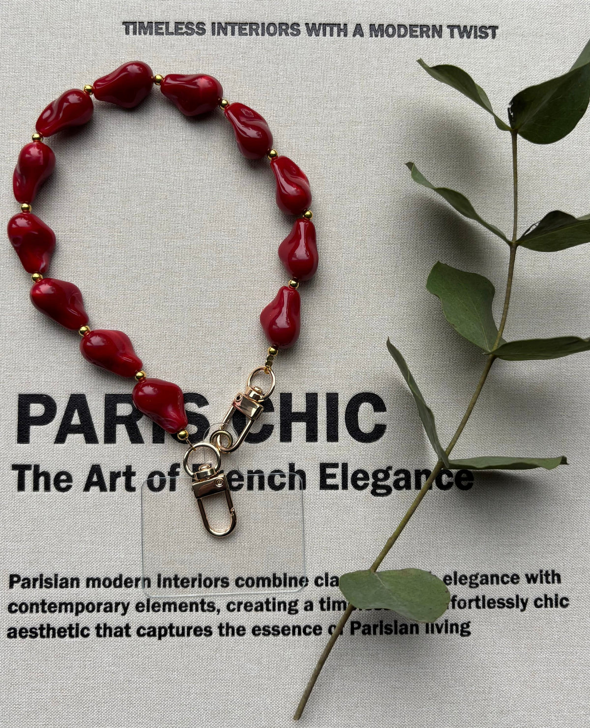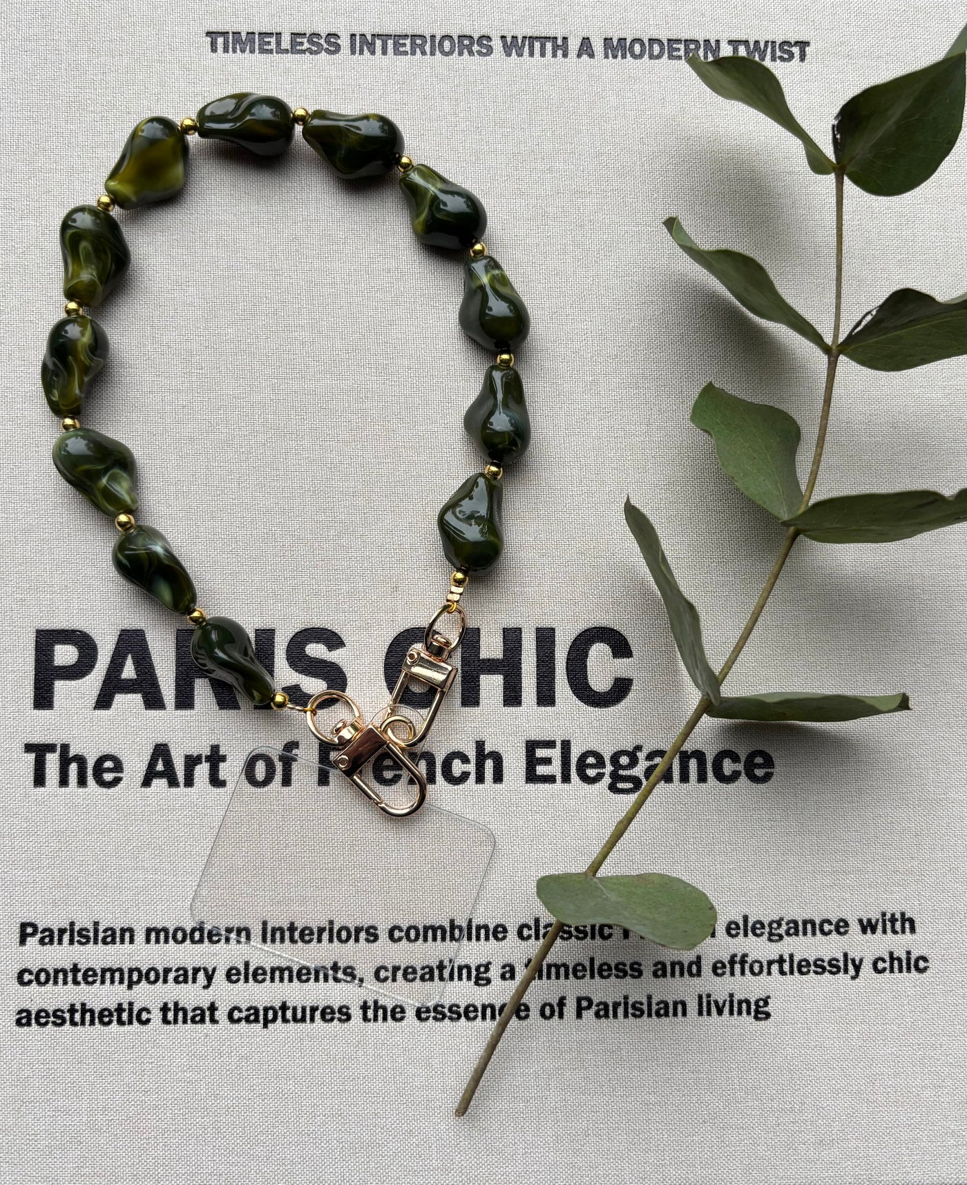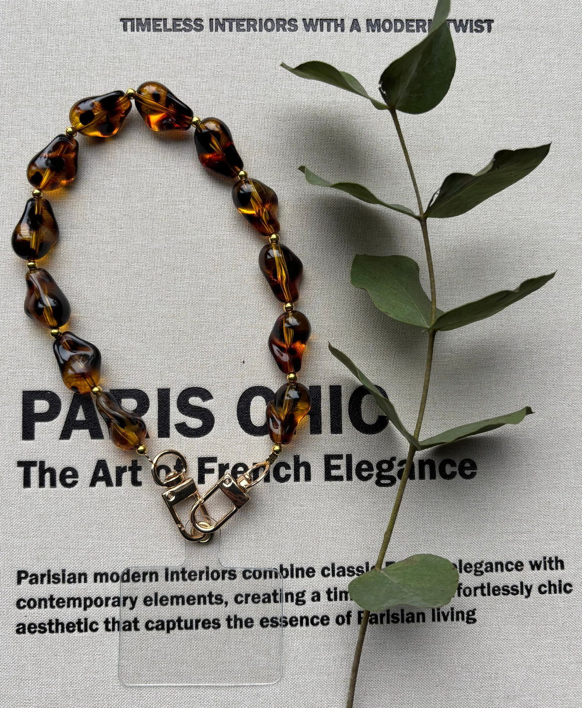 Dit prachtige telefoonkoord is gemaakt van unieke glaskralen met een luxe uitstraling en subtiele glans. De kralen zijn speels van vorm en worden afgewisseld met kleine gouden details voor een chique afwerking. Dankzij de stevige gouden cliphaakjes bevestig je het koord eenvoudig aan je telefoonhoesje.