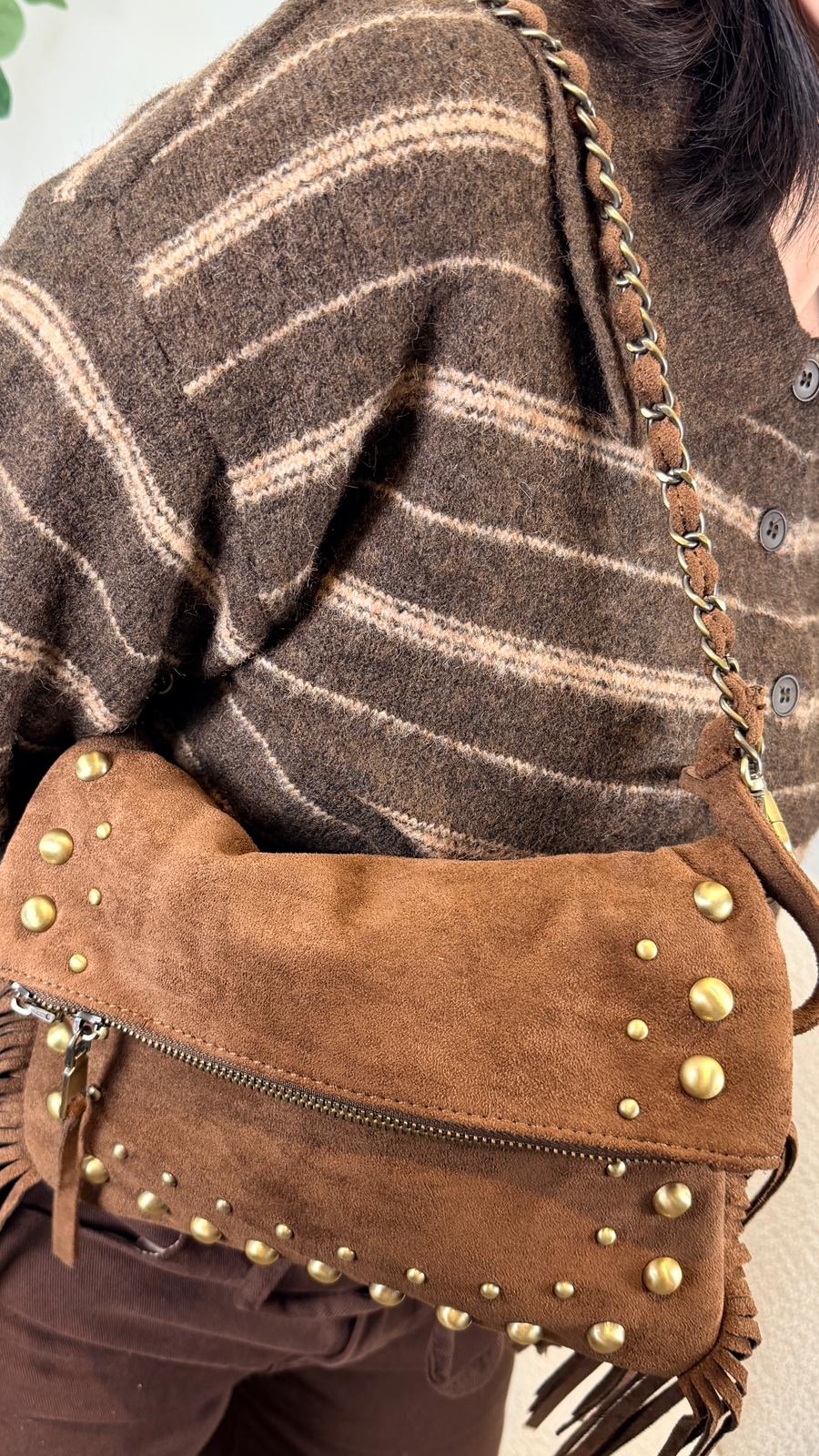 De Valentina Fringe Bag is een echte statement tas voor de vrouw die houdt van een speelse, maar luxe uitstraling 🤍. Het zachte suède wordt gecombineerd met elegante franjes en subtiele gouden studs ✨, wat zorgt voor een vrouwelijke boho-chic look. Draag haar crossbody voor een casual vibe of elegant over de schouder voor een verfijnde touch 💫. Perfect om elke outfit nét dat beetje extra te geven.