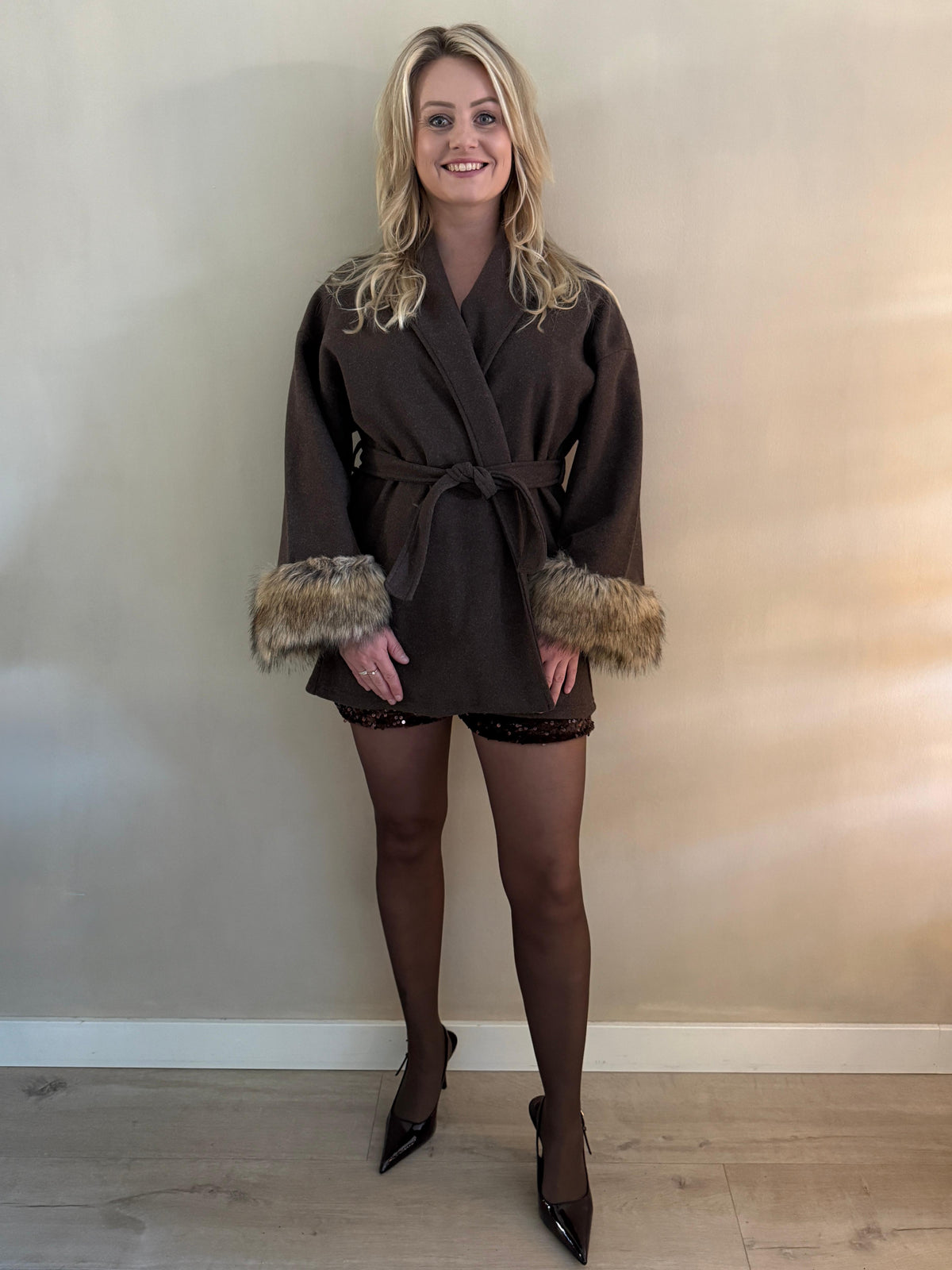 Deze korte jas is helemaal on-trend dankzij het schattige nep-bontje aan de mouwen. Perfect voor een casual dagje uit of om je outfit net dat beetje extra flair te geven.